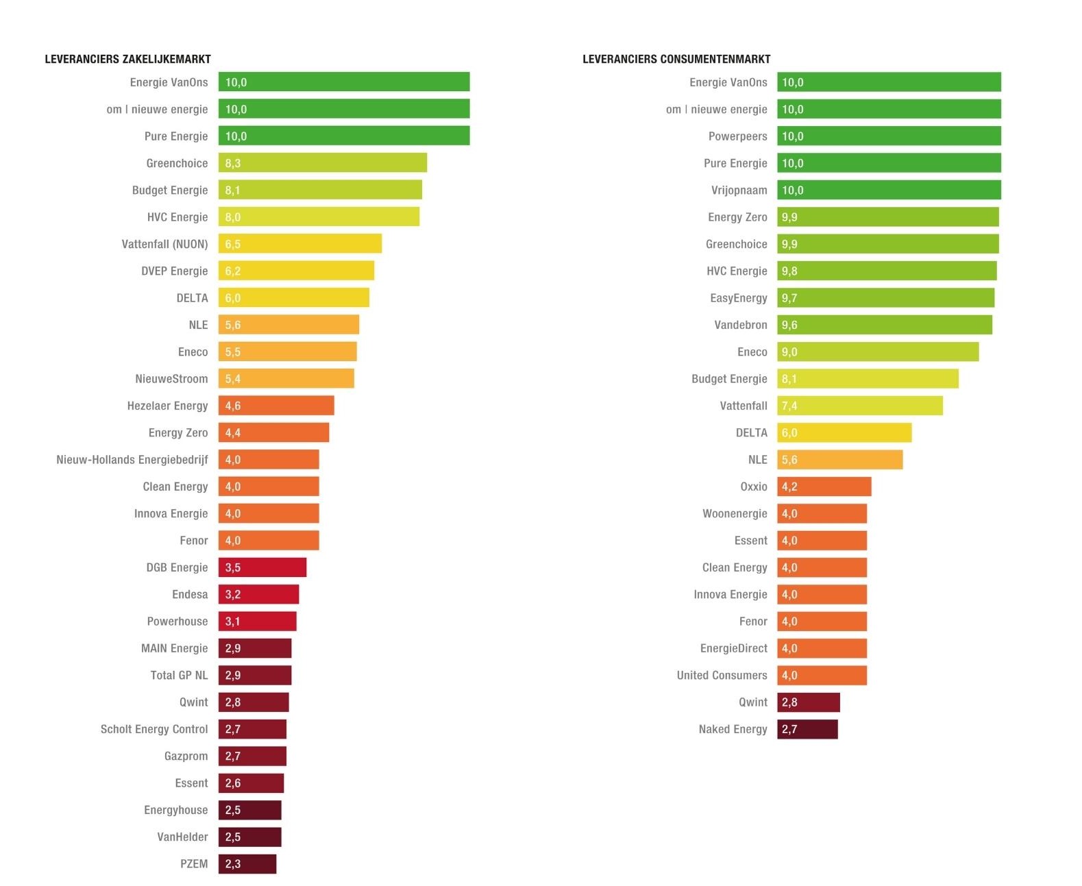 De meest duurzame energieleveranciers op de consumentenmarkt zijn: Energie VanOns, om | nieuwe energie, Powerpeers, Pure Energie en Vrijopnaam. Zij krijgen een 10. Deze leveranciers kopen namelijk ook duurzaam in. Van de grote drie, is Eneco het duurzaamst, en krijgt een 9,0. Vattenfall wordt beloond wegens zijn duurzame investeringen met een 7,4, Essent behoort tot de grijze achterblijvers met een 4,0.